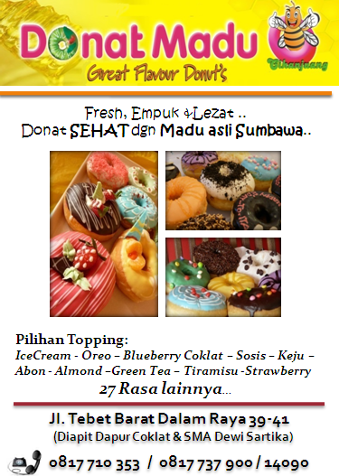 Donat Madu Alamat : Tebet Barat Dalam Raya 39-41 (Diapit Dapur Coklat dan SMA Dewi Sartika) Telpon : 0817 717 353 / 0817 737 900 atau pesandelivery.com 14090 Menyediakan Donat Fresh, empuk dan lezat, donat Sehat berbahan dasar Madu Dengan 27 Pilihan Topping Rasa: Ice Cream - Oreo – Blueberry Coklat – Sosis – Keju – Abon - Almond –Green Tea – Tiramisu –Strawberry, dll. |
